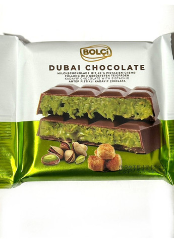 Дубайський шоколад із фісташкою Bolci Dubai Chocolate 100 г Дубайський шоколад із фісташкою Bolci Dubai Chocolate, 100 г — вишуканий десерт, який підкорить серця справжніх гурманів. Це молочний шоколад із ніжною текстурою, у якому гармонійно поєднуються хрусткі нитки катаїфі та насичений фісташковий крем. Унікальне поєднання інгредієнтів дарує неповторний смак і аромат, що викликає асоціації зі східними солодощами. Кожен шматочок шоколаду сповнений яскравих нот фісташки, які створюють насичене й одночасно витончене смакове враження. Bolci Dubai Chocolate стане ідеальним десертом кави або чаю, підкреслюючи теплі моменти. Він також прекрасно підійде як подарунок, дивуючи та потішуючи оригінальним оформленням і якістю. Виготовляється в Туреччині за традиційними рецептами з використанням тільки добірних інгредієнтів, що робить цей продукт символом справжнього смаку та розкоші