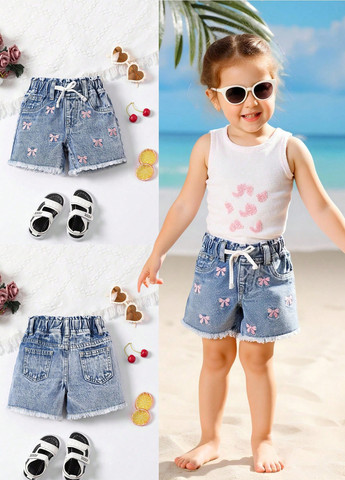 Джинсові шорти для дівчаток. Ці повсякденні шорти вінтажного синього кольору з принтом у вигляді метеликів мають прямий крій та гумку з бахромою на талії. Рекомендується прати або професійне хімчистка.