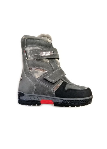 Зимові черевики для хлопчика, темно-сірого кольору. Виконані з натуральної шкіри на суцільній підошві з протектором. Спереду — застібка на хлястики з липучками. Усередині набивна шерсть на тканинній основі. Розмірна сітка: 27-17,5см, 28-18 см, 29-18,5 см, 30-19см