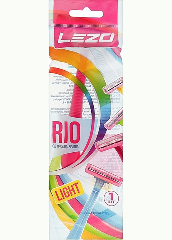 Опис Одноразовий станок для гоління "Ріо", 1 шт. Гладенька шкіра без зайвих волосків — не лише модний тренд, а й комфорт і естетичний, привабливий вигляд. Як саме отримати бажаний результат? У кожної дівчини свої рецепти і переваги у виконанні процедури. Хтось робить воскову або лазерну депіляцію, хтось — шугаринг. Але є й ті, хто дотримується простоти класичної процедури вологого гоління, а для її виконання вибирає одноразові станки Lezo Rio. Аксесуар ергономічний, простий і зручний в експлуатації — лаконічний вибір для домашнього застосування та поїздок. Особливості одноразового бритвеного станка «Ріо» від бренда Lezo: - два гострі леза;- оснащений зволожувальною смужкою;- застосовується для вологого гоління;- комфортний і безпечний в експлуатації;- не створює загрози глибоких порізів;- легко зрізує найкоротші волоски;- ергономічна форма головки;- плавне і легке ковзання;- зручна ручка з фактурною поверхнею;- не вислизає під час процедури гоління;- яскраве, красиве забарвлення. Спосіб застосування Шкіру попередньо необхідно змочити теплою водою, нанести пінку або гель для гоління, і тільки після цього використовувати бритву. Якщо ви кілька разів пройдетеся бритвою по шкірі, опускайте леза під проточну воду так, щоб вода стікала від задньої частини касети вперед, змиваючи з лез волоски і залишки продуктів для гоління. Добре струсіть, щоб обсушити леза.