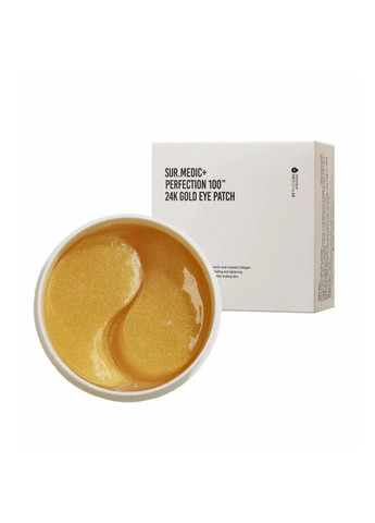 Sur.Medic+ - Perfection 100TM 24K Gold Eye Patch - золоті гідрогелеві патчі під очі. Їх формула містить комплекс 6 пептидів, золото і колагенову воду, завдяки чому патчі помітно покращують еластичність тонкої шкіри і зменшують помітність дрібних зморшок. Потрійна гіалуронова кислота піклується про зволоження та освітлення ніжної шкіри під очима, а ніацинамід надає патчам антиоксидантних властивостей і вирівнює тон. Продукт можна зберігати в холодильнику, щоб патчі були прохолодними та зменшували набряки. В упаковці – 60 штук. Активні компоненти: комплекс 6 пептидів - розгладжує дрібні зморшки, регенерує, золото - підвищує еластичність шкіри, колагенова вода - зволожує, розгладжує, зміцнює, гіалуронова кислота та її похідні - зволожують, зв'язують вологу в епідермісі, розгладжують, ніацинамід - антиоксидант, нейтралізує дію вільних радикалів, вирівнює тон шкіри. Дія засобу: зволожує, ущільнює шкіру, покращує еластичність, розгладжує. Виробник рекомендує засіб для: сухої шкіри під очима, помітних дрібних зморшок, темних кіл під очима. Спосіб використання: Після ретельного очищення і тонізації шкіри прикласти патчі під очі і зачекати 15-20 хв, потім акуратно зняти. Об'єм: 60 шт. / 75 g