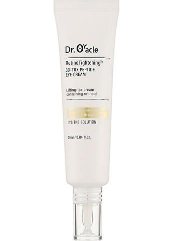 Dr. Oracle Retino Tightening 3D-TOX Peptide Eye Cream — це інноваційний засіб для догляду за шкірою навколо очей, який допомагає зменшити ознаки старіння, покращити еластичність і розгладити зморшки. Завдяки потужній формулі на основі ретинолу та пептидів, крем забезпечує глибоке живлення і зміцнення шкіри. Підходить для чутливої шкіри, забезпечуючи помітний ефект підтяжки без подразнень. Основні компоненти: Ретинол — стимулює вироблення колагену, сприяє оновленню клітин і бореться з ознаками старіння. Пептиди — укріплюють шкіру, підвищують її пружність та покращують текстуру. Гіалуронова кислота — забезпечує інтенсивне зволоження, зменшуючи появу дрібних зморшок. Ніацинамід — освітлює шкіру, зменшуючи темні кола під очима. Центелла азіатська — заспокоює шкіру, знімає подразнення та покращує регенерацію. Основні властивості: Антивіковий ефект: Зменшує глибину зморшок і запобігає утворенню нових. Розгладжує текстуру шкіри, роблячи її гладкою та сяючою. Освітлення: Бореться з темними колами і зменшує набряки. Глибоке зволоження, що попереджає сухість і лущення. Легка текстура: Швидко поглинається, залишаючи відчуття комфорту. Спосіб застосування: Нанесіть невелику кількість крему на чисту шкіру навколо очей, легкими поплескувальними рухами розподіліть до повного поглинання. Використовуйте вранці та ввечері.