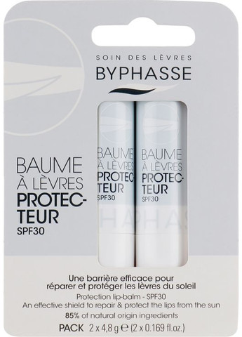 Привабливі губи – не завжди стійка червона помада або насичений блиск, це перш за все доглянута шкіра, яка вирізняється здоров'ям і красою. За допомогою бальзаму Protection Lip іспанського бренда Byphasse ви завжди залишатиметься на висоті та підкорюватиме оточення гладенькими, об'ємними й насиченими природним відтінком устами. До того ж цей продукт збагачений фактором захисту SPF30, який перешкоджає агресивному впливу ультрафіолетових променів.Особливості Protection Lip Balm бренду Byphasse:- до комплекту входять два ідентичні бальзами; - збагачені захистом SPF30 і фільтрами UVB / UVA; - вітаміни А і Е ефективно живлять чутливу шкіру; - масло ши мінімізує вплив зовнішнього середовища; - сприяє ущільненню гідроліпідної мантії губ; - бджолиний віск забезпечує зміцнення захисного бар'єру епідермісу; - олія виноградних кісточок делікатно пом'якшує; - дає змогу уникнути сухості, зневоднення, утворення лущення; - не містить ароматизаторів і барвників; - на 85 % складається з натуральних інгредієнтів.