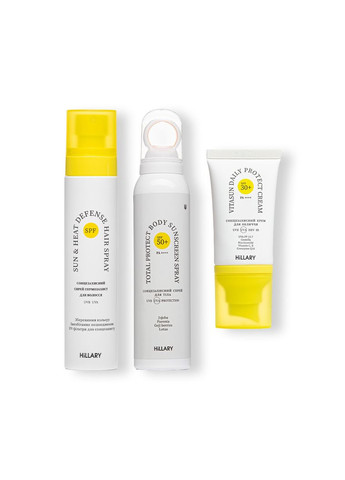 Набір захисту від сонця Hillary - Ваш незамінний супутник у сонячні дні! Сонцезахисний крем для обличчя SPF 30+ Hillary VitaSun Daily Protect Cream Ідеальний для щоденного використання крем, який забезпечує потужний захист від UVA, UVB, HEV та IR випромінювання. Завдяки сучасному міксу фільтрів Uvinul A plus B та Tinosorb M, крем ефективно працює у невеликих кількостях, не вимагаючи поновлення протягом дня. Він чудово підходить як база для макіяжу. Екстракти паростків соняшнику та насіння дерева тара захищають колаген шкіри, зберігаючи її пружність. Комбінація вітамінів С та Е, а також коензим Q10, запобігає фотопігментації та надає потужну антиоксидантну активність. Екстракт центелли азійської та ніацинамід заспокоюють шкіру, вирівнюють її тон і забезпечують оптимальний рівень зволоження. Сонцезахисний спрей-термозахист для волосся Hillary Sun&Heat Defense Hair Spray Захисний спрей, який оберігає волосся від сонячних променів і термічного впливу. Комплекс протеїнів рису та коноплі зміцнює волосся на 85%, запобігаючи його посіченості та тьмяності. Низькомолекулярні УФ-фільтри захищають меланін та пігмент барвників від вигорання. Спрей додає волоссю яскравого блиску, запобігає накопиченню пилу та міського смогу, зберігаючи його свіжість на довший час. Сонцезахисний спрей для тіла SPF 50+ Hillary Total Protect Body Sunscreen Spray Легка текстура водостійкого спрею містить сучасні хімічні та фізичні фільтри, що захищають від UVB та UVA випромінювання, попереджаючи опіки та фотостаріння. Лотос освітлює пігментацію, а льон та ягоди годжі заспокоюють шкіру, запобігають зневодненню та сприяють відновленню еластичності. Олія жожоба підтримує вологий баланс шкіри, роблячи її м'якою та ніжною. Спрей легко наноситься і швидко вбирається, не залишаючи слідів або відчуття плівки. Забезпечте свою шкіру та волосся найкращим захистом з набором від Hillary! До набору входять: Спосіб застосування Невелику кількість крему нанесіть на очищену шкіру обличчя дуже тонким шаром. Зачекайте 2-3 хв та нанесіть другий тонкий шар. В умовах пляжу чи тривалого перебування на активному сонці необхідно оновлювати захист кожні 2 години. Перед використанням спрею для тіла - добре струсіть. Тримайте балон на відстані 10 см від шкіри та розпилюйте значну кількість продукту, розтерши руками, за 20 хвилин до виходу на сонце. Повторно використовуйте кожні 2 години під час тривалого перебування на сонці, особливо після пітніння, купання чи витирання рушником. Для захисту від сонця невелику кількість спрею для волосся нанести на сухе або злегка вологе волосся по всій довжині, не змивати. У разі тривалого впливу сонця можна наносити кілька разів протягом дня. Для термозахисту рівномірно нанести спрей на вологе волосся до початку вкладання феном. Або на сухому волосі перед використанням плойки вирівнювача для волосся.