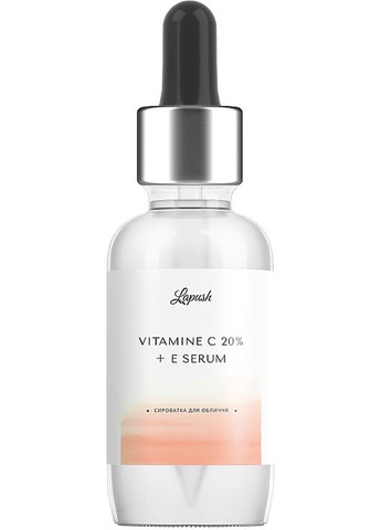 Красива, здорова шкіра, наповнена сяйвом, – результат комплексного догляду, в якому крім обов'язкових засобів для очищення, тонізування та зволоження неодмінно має бути сироватка для обличчя бренда Lapush. Засіб розроблений на основі вітаміну С (20 %), гіалуронової кислоти і компонентів рослинного походження. Саме висока концентрація активних компонентів зумовлює ефективну дію: знімає сліди втоми, освітлює, захищає від негативного впливу УФ-променів, робить епідерміс пружним. Справжній вітамінний заряд краси і молодості вашої шкіри! Особливості Vitamine C + E Serum від бренда Lapush:- після всотування не залишає липкості і жирності;- з тонким приємним ароматом;- вирівнює колір обличчя;- забезпечує свіжий, відпочилий вигляд;- наповнює природним сяйвом;- усуває почервоніння;- кропива прискорює обмінні процеси;- чебрець знімає запалення;- звіробій робить пори вужчими і насичує вітамінами;- екстракт березового листя антибактеріальний, багатий на мікроелементи;- алое насичує вологою і попереджає її втрату;- мати-й-мачуха знімає подразнення;- корінь конжака, що наділений регенераційною властивістю, тонізує;- можна використовувати щодня.