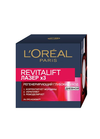 Опис Денний антивіковий крем-догляд потрійної дії для шкіри обличчя - LOreal Paris Revitalift Laser Х3 Технологія денного крему Revitalift Laser Х3 від легендарного виробника L’Or?al Paris розроблена французькими фахівцями з метою комплексного догляду за шкірою, який містить у собі живлення, розгладження та стимулювання всіх природних функцій. Легка консистенція крему ідеально лягає на шкіру і має м’який аромат, у якому переплелися нотки жасмину, груші й пачулів. За аналогією з лазером, формула денного крему проникає в глибокі шари шкіри і стимулює процес регенерації клітин. У результаті шкіра омолоджується, вирівнюється її поверхня, значно поліпшується колір. Косметичний засіб нормалізує регенерацію та мікроциркуляцію в тканинах. Revitalift Laser Х3 - унікальний препарат для догляду, в результаті застосування якого значно зменшаться зморшки й відновляться контури обличчя. Спосіб застосування Спосіб застосування: нанесіть необхідну кількість денного крему на шкіру обличчя. Рівномірно розподіліть по поверхні й залиште до повного всотування. Склад Aq / Water, Glycerin, Isohexadecane, Hydroxypropyl Tetrahydropyrantriol, Dimethicone, Isopropyl Isostearate, Aluminum Starch Octenylsuccinate, Propylene Glycol, Nylon-12, Octyldodecanol, Cetyl Alcohol, Behenyl Alcohol, Ammonium Polyacryloyldimethyl Taurate, Adenosine, Capryloyl Salicylic Acid, Disodium Edta, Hydrolyzed Hyaluronic Acid, Triethanolamine, C13-14 Isoparaffin, Cetearyl Alcohol, Cetearyl Glucoside, Disodium Stearoyl Glutamate, Laureth-7, Myristic Acid, Palmitic Acid, Peg-100 Stearate, Polyacrylamide, Polyethylene, Stearic Acid, Benzyl Alcohol, Citronellol, Isoeugenol, Limonene, Linalool, Ci 15985 / Yellow 6, Ci 19140 / Yellow 5, Phenoxyethanol, Parfum / Fragrance. (F.I.L. B231027/1).