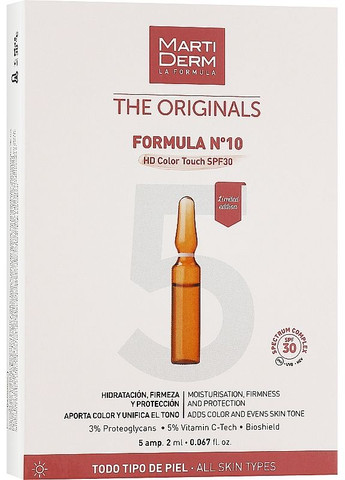 Опис Антивікові ампули для обличчя Перші вікові зміни, спровоковані негативним впливом навколишнього середовища, коригують не лише щоденні образи, а й настрій, викликаючи апатію та нерозуміння. Щоб вберегти себе від передчасного формування таких недосконалостей, відновити, захистити й повернути вибагливій шкірі шарм юнацького сяйва — зверніть увагу на Originals Formula №10 HD Color Touch від бренда MartiDerm. Унікальні ампули, вдосконалені високим показником SPF — 30, нейтралізують агресію зовнішніх і внутрішніх факторів (включаючи UVA і UVB випромінювання та синього світла), підтримуючи природні процеси регенерації та клітинного оновлення. Функціональний б’юті-продукт дбайливо розгладжує мімічні зморшки, зменшує виразність тонких ліній, не залишає шансів на існування тьмяності, пігментації, незалежно від їхнього походження. До того ж, ароматний засіб вражає неймовірним запахом, що базується на перевагах нот груші, касісу — лікеру з чорної смородини, квіту апельсина, жасмину й лілії, ванілі, бобів тонка, праліне та пачулів. Особливості Originals Formula №10 HD Color Touch SPF30 від MartiDerm: - ароматна есенція виготовлена з натуральних компонентів;- випускається в гігієнічних ампулах одноразового використання;- у комплекті 5 ідентичних флаконів;- будуть доречними для всіх типів шкіри, зокрема чутливого;- не провокують появи подразнень та алергії;- легка консистенція швидко абсорбується;- не залишають липкості й жирності на обличчі;- значно підтягують його овал, усуваючи дряблість;- вирівнюють рельєф і розгладжують відтінок;- запобігають появі ознак дегідратації;- активно борються із сухістю, лущенням, почервонінням;- мають протизапальні та заспокійливі властивості;- вирізняються живильними, зволожувальними функціями;- чудово освіжають і тонізують. Спосіб застосування Струсити перед використанням, щоб забезпечити рівномірне розподілення пігментів. Нанести ? ампули вранці на шкіру обличчя, шию і декольте. Розподілити масажними рухами до повного поглинання. Склад Aq (Water), Homosalate, Propanediol, Ascorbyl Glucoside,Bis-Ethylhexyloxyphenol Methoxyphenyl Triazine,Ethylhexyl Salicylate, Glycine Soja (Soybean)Protein, CI 77891 (Titanium Dioxide), SorbitanOleate, Polyglyceryl-4 Laurate/Succinate,Bis-PEG-12 Dimethicone, IsoamylP-Methoxycinnamate, Dimethicone, TocopherylAcetate, Butylene Glycol Dicaprylate/Dicaprate,Dibutyl Adipate, Phenyl rimethicone,Acrylates/Ethylhexyl Acrylate Copolymer,Triethoxycaprylylsilane, Laureth-21, AminomethylPropanol, Ascorbic Acid, Theobroma Cacao(Cocoa) Seed Extract, Tocopherol, EthylhexylTriazone, Magnesium Aluminum Silicate, SodiumHydroxide, PEG/PPG-18/18 Dimethicone, ButyleneGlycol, Disodium EDTA, Ethylhexylglycerin,Xanthan Gum, 1,2-Hexanediol, BiosaccharideGum-4, Caprylyl Glycol, Parfum (Fragrance),Phenoxyethanol, CI 77492 (Iron Oxides), CI 77491(Iron Oxides), CI 77499 (Iron Oxides)