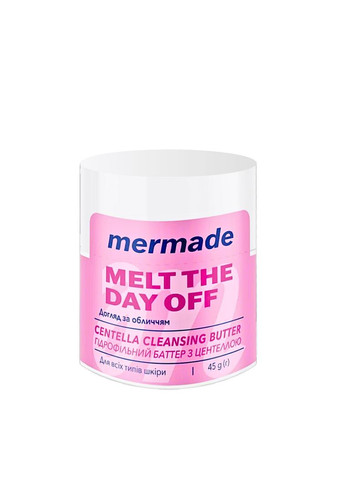 Гідрофільний батер для демакіяжу та очищення шкіри обличчя Mermade Melt The Day Off з центелою 45 г Гідрофільний батер для очищення шкіри обличчя створений для того, щоб ніжно «розтоплювати» забруднення, що накопичуються впродовж дня — від стійкого макіяжу до пилу та себуму. Легка олійна текстура під час контакту з водою перетворюється на шовковисте молочко, що залишає шкіру чистою, м'якою й без відчуття стягнення. Це демакіяж підходить для всіх типів шкіри: сухої, жирної, комбінованої та чутливої. Переваги: зручна й економічна тара; не розтікається; легко дозується; використовується до останньої краплі. Активні компоненти: олія ши — відновлює, пом'якшує, запобігає сухості; олія оливи — живить, підтримує природний гідробаланс шкіри; екстракт центели азійської — знімає подразнення, сприяє рівному здоровому тону обличчя. Як користуватися: Трохи батера нанесіть сухими руками на суху шкіру обличчя. Масажуйте 1-2 хвилини. Змочіть долоні теплою водою і знову промасуйте, поки батер не перетвориться на емульсію. Змийте чистою водою. Завершіть очищення пінкою або гелем. Вага: 45 г