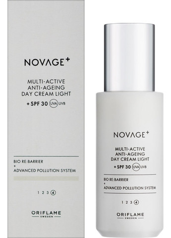 * - термін придатності (вжити до 03.2026 р.) * - нетоварний вигляд паковання Легкий мультиактивний денний крем для обличчя SPF30 з серії Oriflame Novage+ дбає про красу, молодість та здоров’я шкіри. Засіб заснований на інноваційних запатентованих технологіях та натуральних компонентах, які інтенсивно зволожують, зміцнюють та захищають природний бар’єр. Крем бореться з 10 ознаками старіння – втратою об’єму шкіри, гладкості, пружності, сухістю епідермісу, розширеними порами, тьмяністю, зморшками, надмірним себумом, нерівним тоном та чутливістю шкіри. За результатами клінічних випробувань вже через 15 хв зменшується видимість зморшок, через 6 тижнів: 96% підтверджують підвищену гладкість шкіри, 92% – більшу сяйливість, 90% відчули, що шкіра стала більш м’якою та зволоженою, міцнішою та еластичнішою. Особливості Oriflame Novage+ Multi-Active Anti-Ageing Day Cream Light - унікальна формула з технологією Bio Re:Barrier, яка діє як ніацинамід, відновлюючи бар’єр шкіри, запобігаючи втраті вологи та стимулюючи вироблення колагену;- запатентована Advanced Pollution System захищає шкіру від стресу та факторів навколишнього середовища;- гіалуронова кислота бореться зі зморшками, сухістю та стягнутістю шкіри, а також робить її більш гладенькою;- вітамін Е надає потужну антиоксидантну дію;- екстракт зніту вузьколистого матує, розгладжує та освітлює епідерміс;- олія насіння капуаку миттєво та надовго пом’якшує шкіру;- сквалан надає зволожувальну та захисну дію.