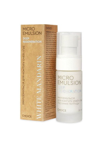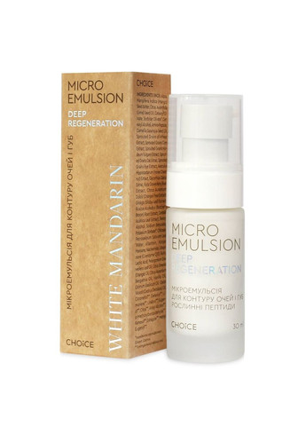 Мікроемульсія для контуру очей та губ усуває набряклість, купероз, покращує колір шкіри навколо очей шляхом активізації крово- та лімфообігу, зміцнення капілярів. • Екстракти пророщених зерен, багаті на білки, вітаміни й мікроелементи, сприяють омолодженню дерми. • Рослинні олії допомагають глибокому зволоженню. • Регулярне використання мікроемульсії для контуру очей та губ «Рослинні пептиди» відновлює природний рівень зволоженості шкіри, необхідний для захисту від передчасного старіння, та забезпечує активний ліфтинг. Помітно зменшує дрібні зморшки та гусячі лапки, усуває набряки та темні кола під очима. ПЕРЕВАГИ Перевагою всіх натуральних косметичних засобів WHITE MANDARIN є системний підхід – RENEWAL SYSTEM, що сприяє оновленню природної краси. Кожен засіб враховує всі потреби шкіри: • білково-вітамінне харчування • захист клітин та активація факторів довголіття завдяки потужним антиоксидантам • активізація лімфотоку. Унікальність рослинних пептидів, які входят до складу мікроемульсії, у порівнянні з білками та амінокислотами, в тому, що їхні молекули достатньо малі, тому мають швидку проникність, а структура пептида за біохімічним складом достатньо складна, і завдяки цьому вона активно впливає на здатність клітин до регенерації. • Регенерація клітин і тканин шкіри здійснюється через здатність рослинних пептидів швидко знаходити й розпізнавати місця їх руйнувань і пошкоджень, запускати відновлювальні процеси. • Пептиди ніби «зшивають» мембранні клітини й клітини епідермісу, підвищуючи тонус шкіри й підтягуючи її. • До складу мікроемульсії також входять: коньяк маннан та хітозан, які забезпечують моментальне і тривале зволоження шкіри, стійкий видимий ефект, після нанесення дають відчуття гладкості та шовковистості. • Рослини, які ми використовуємо для отримання екстрактів, вирощують відповідно до вимог органічного землеробства (без хімічних добрив і пестицидів, мають сертифікат «Органік») або в дикій природі в екологічно чистих районах. • Мікроемульсія не містить SLS/SLES, продуктів нафтохімії, парабенів, силіконів, синтетичних ароматизаторів та барвників. • У мікроемульсії для контуру очей та губ відсутні мінеральна олія (Mineral Oil — інгредієнт, що отримується з нафти), а також її похідні (Propilene Glycol, Paraffinum Liquidum, Petrolatum), які сповільнюють ріст і розвиток клітин, призводять до обезводнення і до раннього старіння шкіри. • Замість цих компонентів ми використовуємо натуральні олії: олію манго, камелії, кісточок лайма. • Впливаючи на клітини шкіри, вони зволожують і пом'якшують її, стимулюють процеси регенерації, перешкоджаючи старінню. АКТИВНІ КОМПОНЕНТИ • Екстракт пророщених зерен вівса, пшениці, ячменю, кукурудзи, жита та амінопептиди є джерелом рослинних пептидів. Це будівельні компоненти білків шкіри (колагену й еластину). Амінопептиди включають незамінні амінокислоти (необхідні поживні речовини для відновлення) та виконують функцію сигнального з’єднання та прискорює синтез білків, гіалуронової кислоти та ділення стовбурових клітин. Як наслідок – розгладжуються зморшки, підвищується тургор та еластичність, зникає в’ялість і сухість дерми. • Олії манго та камелії • Олії кісточок лайму та екстракт центели • Коензим Q10 • Екстракт кінського каштану • Екстракт рути • Екстракт кореня рускусу понтійського та гін