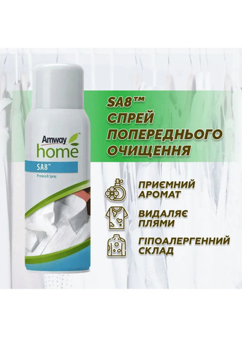 Спрей для попереднього виведення плям SA8™ — ефективний засіб, що легко видаляє забруднення без потреби в замочуванні чи попередньому пранні. Достатньо нанести невелику кількість спрею безпосередньо на пляму, після чого випрати річ звичайним способом. Підходить для всіх видів тканин, які не линяють, включно з плісированими, і ефективний у широкому діапазоні температур. Порада від Amway: Обробіть комірець чи манжети чоловічої сорочки спреєм SA8™ — і після прання вас чекатиме бездоганна чистота. Особливості та переваги: Швидко видаляє жирні та масляні плями, сліди від гуталіну та чорнила завдяки поєднанню розчинників і ПАР; Дбайливо доглядає за усіма типами тканин, зокрема делікатними і нелиняючими; Має приємний, ненав’язливий аромат; Допускається для використання з дитячим одягом з перших днів життя*; Гіпоалергенний і безпечний для шкіри та органів дихання при застосуванні згідно з інструкцією**. Термін придатності: 36 місяців. Країна виробник: США. * Безпека використання для дитячих речей підтверджена додатковими дослідженнями за умови правильного застосування. ** За даними клінічних досліджень, проведених на замовлення Amway. Рекомендації щодо застосування: Призначений для всіх стираних тканин, які не линяють, у тому числі плісированих виробів; Тримайте балончик на відстані близько 15 см від плями; Розпиліть засіб безпосередньо на забруднення; Після обробки виперіть річ у звичайному режимі; Для стійких плям може знадобитися повторна обробка; Для досягнення найкращого результату обробляйте плями якомога швидше після їх появи. Застереження: Не розпилюйте засіб на фарбовані поверхні, а також на внутрішні частини пральних машин і сушарок.