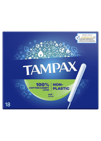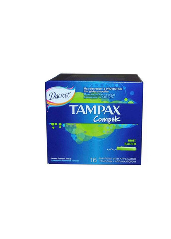 Тампони Tampax Compak Super захищають від протікань в дні з помірними та рясними менструальними виділеннями. Тампони Tampax Compak — це практичне рішення, що забезпечує захист під час менструації. Вони не містять ароматизаторів і барвників. Тампони Tampax Compak мають компактний пластиковий аплікатор із закругленою верхівкою для комфортного введення. Поглинальні канали спрямовують рідину всередину тампона, а спеціальна подвійна захисна спідничка забезпечує додатковий захист від протікань. Тампони Tampax Compak перевірені гінекологічно. Вони також пройшли незалежне випробування на вміст шкідливих речовин та отримали сертифікат стандарту Oeko-Tex 100. Надійний захист від протікань і повна свобода дій.