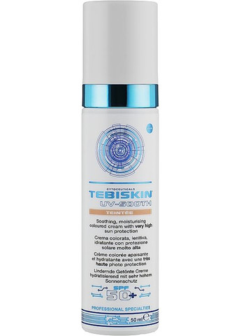 Tebiskin Uv-Sooth Teintee SPF 50+ — ефективний продукт для догляду, який поєднує властивості легкого тонального флюїду та високоякісного сонцезахисного засобу. Такий крем буде ідеальним рішенням для щоденного використання, подбавши про належне живлення та надійний захист шкірного покриву. Крем забезпечує комфортне нанесення, адаптується до природного кольору обличчя та миттєво всотується, не допускаючи утворення ефекту маски й даючи змогу шкірі дихати. Формула догляду засобу, збагачена спеціальними активними речовинами, сприяє пом'якшенню та зволоженню епідермісу, нейтралізує активність вільних радикалів. Якісний косметичний продукт заспокоює почервоніння й стимулює клітинну регенерацію, покращує пружність шкіри та зміцнює її бар'єрні властивості, а також захищає від передчасного старіння. Спосіб застосування: наносити на шкіру щодня вранці за 20 хвилин до виходу на вулицю та делікатно масажувати за масажними лініями до повного всотування крему. За необхідності наносити засіб повторно протягом дня.