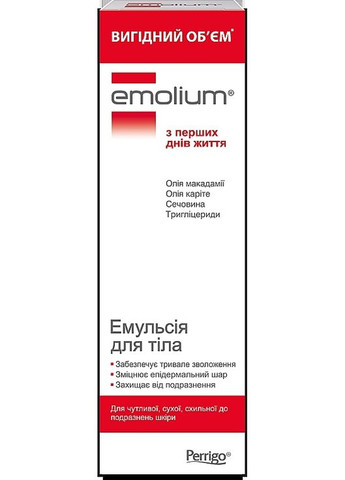 Емульсія для тіла – зволожуючий засіб для догляду за сухою та чутливою шкірою дітей з 1го дня життя та дорослих. У складі - натуральні олії для захисту епідермального бар'єру шкіри (олія макадамії, олія ши), а також гідроксиетилсечовина і гіалуронат натрію для зволоження глибоких шарів епідермісу та утримання вологи в шкірі. Підходить для всіх ділянок тіла.
