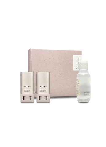 В набор входить: 1. Su:m37° Sun-away Velvet Sun Stick SPF50+ PA++++ 18г - 2 шт 2. Su:m37° Skin Saver Cleansing Water 100мл 1)Сонцезахисний стик Su:m37 Sun-Away Velvet Sun Stick із SPF 50+ / PA++++ коригує текстуру шкіри, роблячи її гладкою, як оксамит, навіть при багаторазовому нанесенні. Це сонцезахисний стик подвійного призначення - можна наносити як на обличчя, на тіло і як базу під макіяж. У виробництві засобу використовуються компоненти, які зменшують подразнення та підвищують ефективність завдяки процесу ферментації. Інгредієнти стика проникають глибоко у шкіру. Стік ефективніше блокує УФ-промені, захищає пошкоджену УФ-випромінюванням шкіру. Він служить як сонцезахисний крем із функцією догляду за шкірою. Стік може бути використаний як основа під макіяж. З кожним нанесеним шаром ви отримуєте більш гладку бархатисту текстуру шкіри. Його легко та зручно носити з собою, щоб завжди була можливість нанести захист та поправити макіяж протягом дня. Він має шовковисте, бархатисте покриття, яке заповнює нерівності та пори без будь-якої липкості. Нанесіть на обличчя на останньому етапі ранкового догляду. Засіб наносити кілька разів на день. Можна наносити на макіяж. Обсяг засобу-18 р. 2. Su:m37° Skin Saver Cleansing Water 100мл - Унікальний очищуючий продукт, який поєднав в собі очищувальну воду і тонер. Делікатно очищає навіть саму суху та чутливу шкіру. Залишає її на довго зволоженій та наповненій, т.к. після демакіяжу не потрібно додатково вмиватися пінкою. Достатньо просто сполоснути обличчя водою.
