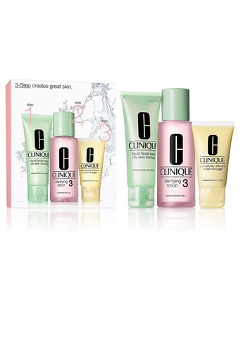 Склад набору: Рідке мило для обличчя Clinique Liquid Facial Soap Mild - 50ml Лосьйон, що відлущує Clinique Clarifying Lotion 3 - 100ml Зволожуючий гель Dramatically Different Moisturizing Gel - 30ml