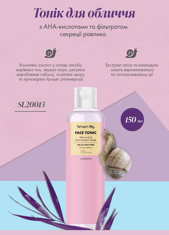 Тонік для обличчя з АНА-кислотами та фільтратом секреції равлика Smart Life для всіх типів шкіри призначений для зволоження, м'якої тонізації та відновлення природного pH епідермісу. Комплекс кислот у складі засобу вирівнює тон, звужує пори, регулює вироблення себуму, освітлює шкіру та прискорює процес регенерації. Активні компоненти, пантенол та алантоїн насичують шкірний покрив вологою. Фільтрат секреції равлика підвищує еластичність та пружність шкіри, зменшує прояви подразнень. Екстракт алое і календули надають відновлювальну та заспокійливу дію. Тонік освіжає шкірний покрив та дарує приємні відчуття комфорту. Головною перевагою засобу є його комплексність у дії на шкіру. АНА-кислоти, що входять до складу тоніки, дозволяють ефективно справлятися з проблемами чутливої, жирної, комбінованої або проблемної шкіри. Вони дбайливо відлущують поверхневі ороговілі клітини, видаляють пошкоджений шар. Це сприяє вирівнюванню кольору, усуненню висипів та плям, зменшенню зморшок та жирового блиску. Фільтрат секреції равлика має потужний антиоксидантний ефект, який оберігає клітини від вільних радикалів, відповідальних за появу зморшок, втрату пружності та водно-жирового балансу зрілої шкіри. Завдяки наявності алантоїну, який є частиною слизу равлика, тонік проникає у глибокі шари дерми, покращує мікроциркуляцію крові. Тонік з AНA-кислотами і фільтратом секреції равлика також має чудові зволожуючі властивості. Алое та календула, які є частиною складу, посилюють вплив один на одного та на шкіру. Активно відновлюють водний гідробаланс у клітинах, запобігають пересиханню та надмірному висиханню шкіри. Результатом турботи про шкіру з використанням цього тоніка є м'якість, сяйво, відчуття зволоженості та свіжості. Також слід зазначити, що Fаrmаsi орієнтується на використання натуральних, безпечних інгредієнтів у своїх засобах, однією з переваг яких є відсутність парабенів та мінеральних олій у складі. Тонік для обличчя з АНА-кислотами та фільтратом секреції равлика Smart Life надає шкірі здорового та доглянутого випромінювання, усуваючи дрібні дефекти та недоліки. Всім типам шкіри потрібно регулярне догляду, і тонік для обличчя з АНА-кислотами та фільтратом секреції равлика Smart Life є відмінним вибором для цього завдання. Ефективна та натуральна формула засобу забезпечує глибоку дію та досягає видимих ​​результатів вже після кількох застосувань. Подаруйте вашій шкірі молодість, красу та здоров'я за допомогою тоніка Farmasi Smart Life! Інструкція по застосуванню Використовувати засіб щодня вранці та ввечері після очищення шкіри. Змочити тоніком ватяний диск, протерти обличчя та зону декольте. Склад Aqua (Water), Glycerin, Propanediol, Lactic Acid, Sodium Citrate, Alcohol Denat, Glycolic Acid, Panthenol, Allantoin, Citric Acid, Polysorbate 20, Phenoxyethanol, Parfum (Fragrance), Propylene Glycol, Snail Secretion Filtrate, Aloe Barbadensis (Aloe Vera) Extract, Calendula Officinalis Extract, Ethylhexylglycerin, CI 60730 Sodium Benzoate, Hexyl Cinnamal, Hexamethylindanopyran, Acetyl Cedrene, Tetramethyl Acetyloctahydronaphthalenes, Linalool, Citronellol, Hydroxycitronellal, Eugenol.