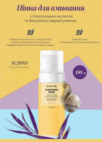 Пінка для вмивання з гіалуроновою кислотою та фільтратом секреції равлика Smart Life для всіх типів шкіри призначена для м'якого очищення епідермісу від надлишків себуму, залишків косметичних засобів та інших забруднень. Гіалуронова кислота у складі сприяє інтенсивному зволоженню, підвищує пружність та еластичність шкірного покриву. Фільтрат секреції равлика стимулює регенерацію, зменшує подразнення та підтримує необхідний рівень гідратації шкіри. Пантенол має загоювальну та протизапальну дію. Пінка має ніжну текстуру, яка очищує шкіру м'яко та дбайливо, не порушуючи її природний баланс. Пінка має приємний аромат, не містить парабенів і штучних барвників. Вона підходить для всіх типів шкіри, у тому числі для чутливої ​​та проблемної. Пінка для вмивання з гіалуроновою кислотою та фільтратом секреції равлика Smart Life має ряд корисних властивостей: - Зволожує шкіру. Інтенсивно зволожуючий компонент, що входить до складу пінки, утримує вологу в глибоких шарах епідермісу, запобігаючи його пересушуванню та лущенню. - стимулює регенерацію клітин. Фільтрат секреції равлика містить активні речовини, що сприяють загоєнню пошкоджень, у тому числі дрібних ран, подряпин та мікродрапин на шкірі обличчя. Це робить пінку ідеальним засобом для щоденного догляду за шкірою. - знімає запалення. Завдяки вмісту пантенолу у складі, пінка має протизапальну дію, знімає подразнення та почервоніння шкіри, зменшуючи прояви акне та інших запальних процесів. - зміцнює захисний бар'єр. Регулярне використання пінки захищає шкіру від шкідливого впливу навколишнього середовища та вільних радикалів, що допомагає запобігти передчасному старінню. - Підвищує пружність та еластичність шкіри. Гіалуронова кислота, що входить до складу пінки, сприяє зволоженню та посиленню пружності шкіри, роблячи її більш пружною та еластичною. Пінка для вмивання з гіалуроновою кислотою та фільтратом секреції равлика Smart Life продається в стильній упаковці об'ємом 150 мл, яка зручна для домашнього та мандрівницького використання. Вона економічна у використанні, тому що на невелику кількість пінки можна отримати рясна піна. Після використання шкіра стає чистою, свіжою та зволоженою. Зробіть ранкове та вечірнє очищення шкіри максимально комфортним та приємним з пінкою для вмивання з гіалуроновою кислотою та фільтратом секреції равлика Smart Life від Farmasi – вашою незамінною помічницею у догляді за шкірою! Інструкція по застосуванню Нанести пінку на вологе обличчя, ніжно помасажувати та змити водою. Використовувати для очищення обличчя від забруднень та макіяжу. склад Aqua (Water), Sorbitol, Sodium Olivoil Glutamate, Coco Glucoside, Glycerin, Cocamidopropyl Betaine, Parfum (Fragrance), Phenoxyethanol, D-Panthenol, Sodium Hyaluronate, Ethylhexylglycerin, Snail Secretion Filtrate, Citric.