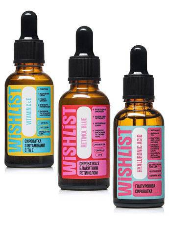 Цей набір створений для досягнення ефекту здорової, сяючої та глянцевої шкіри. Вітамін C освітлює та захищає шкіру від вільних радикалів, гіалуронова кислота забезпечує глибоке зволоження без обтяження, а блакитний ретинол сприяє оновленню клітин, покращуючи текстуру шкіри. Олія австралійського горіха макадамії - благородна олія, яка має потужний антиоксидантний ефект. Має тонку текстуру, без кольору і вираженого запаху.Використовується для догляду за шкірою обличчя та тіла, а також за волоссям. Олія живить, зволожує і пом'якшує шкіру, роблячи її здоровою і красивою. Дуже корисно для сухої шкіри, чудовий антиоксидантний та омолоджуючий засіб. Ідеально для фарбованого, пошкодженого та сухого волосся. Що у складі набору? – Гіарулонова сироватка WiSHLiST HYALURONIC ACID, 30 МЛ для глибокого зволоження! Вона підтримує шкіру пружною та свіжою, запобігаючи надмірному виробленню себуму, яке може виникати внаслідок сухості. – Сироватка з вітаміном C ТА E WiSHLiST VITAMIN C & E, 30 МЛ для яскравого сяйва! Вітаміни C та E діють як потужні антиоксиданти, нейтралізуючи вільні радикали, що сприяють старінню шкіри. Вони освітлюють тон шкіри, надають їй природного сяйва. – Сироватка з блакитним ретинолом WiSHLiST BLUE RETINOL, 30 МЛ для оновлення та гладкості! Блакитний ретинол стимулює оновлення клітин, покращує текстуру шкіри та зменшує прояви дрібних зморшок, роблячи шкіру гладкою та сяючою. Олія макадамії: - зволожує шкіру і відновлює ліпідний бар'єр; - гальмує старіння шкіри, викликане шкідливим впливом навколишнього середовища; - має властивість поглинати УФ-промені; - зволожує і живить сухе та ламке волосся; - живить волосяні цибулини та бореться з випадінням волосся; Активні компоненти: – Hymagic-4D: революційна форма гіалуронової кислоти, яка проникає глибоко в клітини шкіри, забезпечуючи інтенсивне зволоження. – Вітамін C – 0.5%: зменшує пігментацію, стимулює синтез колагену, надає шкірі сяяння і покращує її тон. – Вітамін E – 1%: захищає шкіру від ушкоджень вільними радикалами, сприяє регенерації клітин, зволожує та зміцнює бар'єрні функції шкіри. – Ферулова кислота – 0.5%: підсилює дію вітамінів C та E, запобігає фотостарінню і забезпечує тривалий захист шкіри. – Блакитний ретинол: стимулює оновлення клітин, покращує текстуру шкіри та зменшує прояви зморшок. Як краще використовувати засоби? – Гіалуронову сироватку використовуй щоранку та щовечора на чисту шкіру для надання необхідної гідратації. – Сироватку з вітамінами C та Е застосовуй щоранку перед SPF кремом для максимального захисту та сяйва. – Сироватку з блакитним ретинолом нанось ввечері для оновлення та відновлення шкіри протягом ночі. - Олія макадамії Для шкіри. Застосовувати олію можна щодня перед сном. Наносити тонким шаром на шкіру обличчя, шиї і декольте і почекати, поки вона повністю вбереться. Можна використовувати разом зі шкребком гуа ша для масажу обличчя. Для волосся. Наносити чисту олію макадамії на злегка вологе волосся за 30 хвилин до миття голови 2 рази на тиждень. Закутувати голову в плівку і рушник. Змити шампунем. Застереження Натуральна косметика не є гіпоалергенною. За 24 години до застосування проведіть алергопробу на згині ліктя.