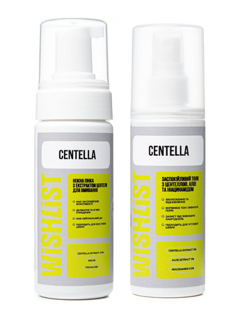 Комплект засобів, які ідеально доповнять твою щоденну рутину по догляду за обличчям. Пінка та сироватка ідеально доповнюють один одного і дарують дбайливе очищення, живлення та відновлення. Засоби з різною концентрацією екстракту центелли азіатської, що пролонгують та підсилюють дію один одного, це знахідка для здорової, відновленої шкіри. Склад набору: - Ніжна пінка з екстрактом центели для вмивання WiSHLiST CLEANSING FOAM, 150 -Сироватка з центелою WISHLIST CENTELLA SERUM, 30 МЛ Активні компоненти пінки та їх вплив на шкіру: – Centella Extract 2.5% :заспокоює та зміцнює, допомагає зняти запалення, зміцнити судини та заспокоїти шкіру після стресу. Твоя шкіра буде виглядати здоровою та сяючою. – Делікатно очищує завдяки мʼяким поверхнево-активним речовинам. Пінка забезпечує ніжне очищення без подразнень, підтримуючи природний баланс шкіри. – Inulin і Trehalose доппомагають відновити мікрофлору, сприяють зміцненню захисного бар'єру шкіри та підтримують її природну мікрофлору. – Підходить для всіх типів шкіри: формула з нейтральним pH створена для щоденного використання навіть на чутливій шкірі. Активні компоненти сироватки та їх вплив на шкіру: – Centella Extract – 7% стимулює вироблення колагену, сприяє загоєнню та покращує мікроциркуляцію шкіри. Це сприяє швидкому відновленню та захисту шкіри, забезпечуючи їй молодість і еластичність. –Комплекс гіалуронових кислот Alpha-glucan проникає в глибокі шари шкіри та утримує вологу на поверхні, забезпечуючи шкірі довготривале зволоження. - Актив Biolin – 1% підтримує мікробіом шкіри, що допомагає зменшити чутливість шкіри та має протизапальну дію, що робить сироваткою ідеальною для всіх типів шкіри, включаючи чутливу. Спосіб використання: 1. Нанести невелику кількість пінки на вологу шкіру, помасажувати обличчя легкими рухами та змити теплою водою. Використовувати вранці та ввечері. 2. Сироватку нанести на очищену шкіру тонким шаром, зачекати до повного поглинання 10-15 хвилин і при потребі нанести крем. Для оптимальних результатів використовуйте щодня. Застереження Натуральна косметика не є гіпоалергенною. За 24 години до застосування проведіть алергопробу на згині ліктя.