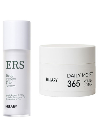 Набір створений для інтенсивного відновлення та глибокого зволоження шкіри. Сироватка Hillary DeepRenew Trio Serum активує клітинне оновлення, розгладжує та зміцнює шкіру, а крем-гель Hillary Daily Moist 365 Relief Cream відновлює баланс і дарує тривалий комфорт без відчуття жирності. Точкова регенерація, омолодження та сяйво – все в одній формулі. Сироватка активно стимулює клітинне оновлення та регенерацію шкіри, зміцнює її захисний бар’єр і підвищує еластичність. Завдяки спікулам покращує мікроциркуляцію та синтез колагену, екзосоми центели заспокоюють і відновлюють шкіру після стресу та запалень, а ресвератрол захищає клітини від окисного стресу та уповільнює процеси старіння. Інтенсивна сироватка нового покоління поєднує 0,25% MagicSpear (морські спікули), 1% екзосом Centella Reversa та 1% ресвератролу для потужної стимуляції клітинного оновлення, захисту від вікових змін і відновлення шкіри після стресу. MagicSpear™ (0,25%) – морські спікули Мікроголкова фракція з морської губки, що проникає у роговий шар шкіри та запускає регенерацію. Спікули стимулюють мікроциркуляцію, синтез колагену й транспортування активів у глибокі шари. Результат – більш щільна, гладка та підтягнута шкіра з ефектом мікропілінгу без відлущування. Мікростимуляція, яку створюють спікули морської губки, діє як природний мікроток: вона активує мікроциркуляцію, посилює надходження кисню до клітин і запускає процеси регенерації. Завдяки цьому шкіра швидше оновлюється, активується синтез колагену та еластину, вирівнюється рельєф і підвищується пружність. Одночасно спікули покращують проникнення активних компонентів у глибші шари, забезпечуючи ефект мікропілінгу без лущення та даруючи шкірі гладкість, свіжість і сяйво. Centella Reversa™ (1%) – екзосоми центели азіатської Інноваційний інгредієнт із факторами росту та пептидами, що відновлює шкіру на клітинному рівні. Прискорює загоєння, зменшує запалення, підвищує еластичність і захисний бар’єр, стимулюючи синтез нового колагену. Resveratrol (1%) – молекула довголіття Міцний природний антиоксидант, що захищає клітини від ушкоджень і уповільнює старіння. Знижує окисний стрес, освітлює й вирівнює тон, активує «гени довголіття» та зміцнює захисні функції шкіри. Крем Hillary Daily Moist 365 Relief Cream – мультифункціональний догляд для балансу, захисту та відновлення усіх типів шкіри. Крем має антивіковий, зволожувальний і відновлювальний ефект та ідеальний як базовий догляд або під макіяж. У складі Niacinamide 3%, що допомагає регулювати вироблення себуму, звужує пори та вирівнює тон шкіри без подразнення. Centella Asiatica Leaf Extract 4% заспокоює, зменшує подразнення та покращує мікрорельєф. Через 6 тижнів використання крему спостерігається зменшення почервоніння на 72%, зменшення видимих ознак старіння на 61%, покращення рівня зволоженості шкіри на 85% і покращення її тонусу на 88%. Завдяки поєднанню гліцерину, гідроксиетилсечовини, пропандіолу та комплексу натуральних цукрів (фруктоза, глюкоза, сахароза), крем інтенсивно зволожує навіть найвимогливішу шкіру, не залишаючи липкого шару. Синергія ніацинаміду, гідролізованого рисового протеїну, вітаміну Е та біоміметичних пептидів (Hexapeptide-12 та Pentapeptide-4) стимулює синтез колагену, покращує тонус шкіри та зменшує прояв вікових змін. Фітокомплекс з екстракту центели азіатської, олії жожоби, рисових компонентів та екстракту орхідеї забезп