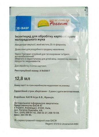 Регент 12,8 мл - препарат нового покоління проти колорадського жука, дротянки, попелиці, капустянки, мурах та ін. Містить активний компонент, який спричиняє загибель жуків та личинок, що завдають великої шкоди для саду та городу при знищенні с/г рослин. Діюча речовина: фіпроніл 25 г/л - Препарат володіє швидкою дією. - Тривалий захисний ефект. - Не фітотоксичний для рослин. - Виключена можливість резистентності шкідників до препарату. - Можна використовувати в умовах спекотного літа. Застосування: Вміст пакета - 12,8 мл розчинити у 8-9 л. води, що достатньо для обробки 2-х соток картоплі або інших рослин. Обприскування проводити в період вегетації. Культура Шкідник Картопля Колорадський жук, картопляна корівка Пшениця озима, пшениця яра, ячмінь озимий, ячмінь ярий Хлібна жужелиця, пьявица, клоп шкідлива черепашка Період захисної дії: 3-4 тижні, протягом даного періоду зберігається високий рівень інсектицидної активності проти дорослих особин і личинок, що дозволяє обмежитися однією обробкою замість традиційних двох-трьох. Термін останньої обробки - за 30 днів до збору врожаю. Кількість обробок: - 1