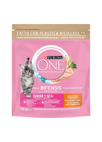 Сухий повнораціонний корм для кошенят. Також підходить для вагітних та лактуючих кішок. Кошенята перебувають на стадії інтенсивного зростання та розвитку. У зв'язку з інтенсивним темпом розвитку їхні харчові потреби є надзвичайно високими. Корм PURINA ONE® Junior спеціально створено для задоволення харчових потреб кошенят (від 1 до 12 місяців), а також вагітних і лактуючих кішок. Високий вміст протеїнів, мінеральних речовин і вітамінів сприяє здоровому розвитку скелету та м'язів. Крім того, корм PURINA ONE® Junior містить ДГК (докозагексаєнову кислоту) – функціональну поживну речовину, що також міститься в материнському молоці та, як доводять дослідження, стимулює розвиток мозку та зору кошенят. Дбаючи про харчування свого улюбленця змалечку, ви допомагаєте йому бути здоровим сьогодні й у майбутньому._• Здоровий розвиток життєво важливих функцій завдяки поживним речовинам, спеціально підібраним для кошенят. • Підтримка розвитку мозку та зору завдяки докозагексаєновій кислоті, що міститься також і у материнському молоці. • Курка є інгредієнтом №1 - хорошим джерелом білка та амінокислот, які допомагають будувати та підтримувати міцні м'язи. • Корм сприяє зміцененню імунної системи кошеняти завдяки Lactobacillus (лактобацилам) - специфічним функціональним бактеріям. • Сприяє покращенню балансу мікробіому кишечника завдяки цикорію, пребіотику. • Підтримка здорової шкіри та блискучої шерсті завдяки Омега 3 та 6 жирним кислотам та необхідним вітамінам і мінеральним речовинам. • Допомагає підтримувати здоров'я кісток завдяки мінеральним речовинам та вітаміну D._Добавки: Поживні кормові добавки: МО/кг(IU/kg): вітамін А: 31000; вітамін D3: 1000; вітамін Е: 400; мг/кг(mg/kg): вітамін С: 140; таурин: 700; сульфат заліза: (Fe: 150); йодат кальцію: (I: 2.3); сульфат міді: (Cu: 15); сульфат марганцю: (Mn: 54); сульфат цинку: (Zn: 130); селеніт натрію: (Se: 0.16). Антиоксиданти, консервант._Поживні речовини: сирий протеїн: 41,0%, сирий жир: 20,0%, сира зола: 8,0%, сира клітковина: 2,0%, докозагексаєнова кислота: 0,05%, Омега-3 жирні кислоти: 0,4%, Омега-6 жирні кислоти: 3,0%._Можна вводити в раціон кошеняти з 3-4 тижневого віку. Після відлучення від матері годуйте кошеня зволоженим водою кормом, це полегшить процес годівлі. Поступово збільшуйте кількість корму і зменшуйте кількість доданої води до повного переходу на сухий корм. Кожне кошеня особливе, тому добова кількість корму та час годівлі можуть відрізнятися в залежності від рівня активності кошеняти та стану його тіла. Поступово збільшуйте кількість корму для годівлі в період вагітності / лактації. Свіжа чиста питна вода повинна бути доступною тварині у будь-який час. Спробуйте також повнораціонні консервовані раціони Purina ONE® у різноманітті смачних рецептів, спеціально розроблених для задоволення потреб Вашої кішки.