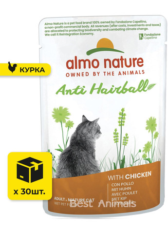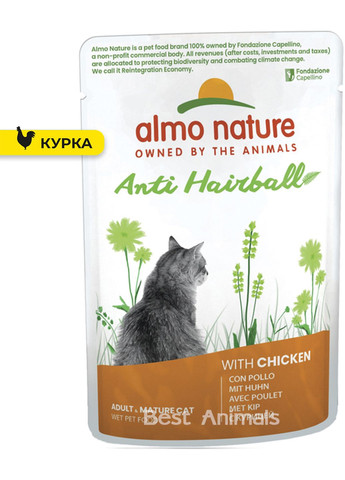 Вологий корм для котів Almo Nature Holistic Functional Cat Anti Hairball підходить для дорослих котів усіх порід. Особливості та переваги: корм добре засвоюється; ідеальна формула для запобігання утворення грудок шерсті у котів; рослинні волокна, які природним чином містяться в інгредієнтах, є джерелом натурального пребіотика та покращують травлення та допомагають підтримувати здоров'я кишечника; основним джерелом протеїнів у кормі є м'ясо та м'ясні субпродукти; не містить штучних консервантів, ароматизаторів та барвників; допомагає підтримувати гарний стан шкіри, красу шерсті та нормальну роботу серцево-судинної системи; склад збагачений вітамінами та мінералами, необхідними для підтримки імунітету та гарного стану кісткової тканини; має відмінний смак. Склад: М’ясо і риба та їх похідні 39,8% (з яких курка 4%), похідні рослинного походження 2,3% (інулін 0,1%), екстракт рослинного білка (1,0%), фрукти (журавлина 4%), мінерали 0,3%. Добавки (на 1 кг): вітамін Е - 28 мг, вітамін В1 - 2,19 мг, таурин - 206,2 мг, DL-метіонін - 210 мг, мідь - 0,54 мг, йод - 0,14 мг, марганець - 1,68 мг, цинк - 14,25%. Аналіз: білки - 8,0%, клітковина - 0,8%, жири - 3,5%, зола - 3,0%, волога - 83,0%. Енергетична цінність: 681 ккал/кг