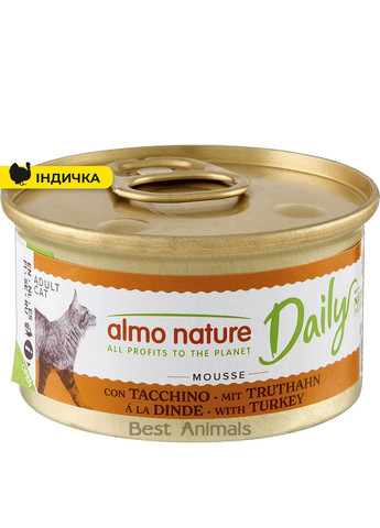 Високоякісний вологий корм, який підходить для дорослих котів усіх порід. Містить інгредієнти високої якості, повністю натуральний корм, не містить штучних консервантів, ароматизаторів або барвників. До складу включено важливий компонент - таурин. Він допомагає зберігати зір і забезпечує нормальну роботу серцево-судинної системи. На жаль, таурин не виробляється організмом котів самостійно в достатній кількості, тому є потреба в отриманні його разом із раціоном. Корм Daily Menu Cat повністю справляється з цим завданням. Переваги: Абсолютно натуральний і безпечний, не містить штучних консервантів і ароматизаторів. Містить достатню кількість таурину. Індичка в складі корму добре засвоюється. Має високі смакові якості, подобається вихованцям. Підходить для вихованців із чутливим шлунково-кишковим трактом. Консистенція: паштет \ мус Тип пакування: консерва Склад: м’ясо та його похідні (індичка 4 %) мінерали, екстракт рослинних волокон. Харчові добавки (на кг): вітаміни А1110МО, D3 140 мг, Е 10 мг, таурин 490 мг, сульфат міді пентагідрат 4.4мг (CU 1.1 мг). Технологічна добавка: камедь касії 3г. Гарантований аналіз: білки 9.5 %, клітковина 0.4 %, жири 6 %, попіл 2 %, волога 81 % Рекомендації щодо годування: Almo Nature - це додатковий корм для дорослих котів. Щоденна порція для здорового дорослого кота вагою близько 4 кг: 110 г вологої їжі + сухий корм (відповідно до рекомендованих норм годування). Тварина повинна мати постійний доступ до чистої питної води Фасування: 85 г Найменування бренду: Almo Nature (Альмо Натюр) Виробник: Альмо Натюр, Альмо Натюр Ес.Пі.Ей. (Альмо Натюр, Альмо Натюр Ес.Пі.Ей.) Країна реєстрації бренду: Італія Розміщення виробничих потужностей: Італія