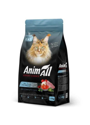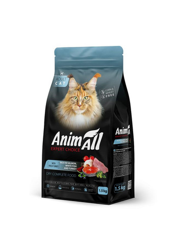 ANIMALL ПОВНОРАЦІОННИЙ СУХИЙ КОРМ ДЛЯ КОТІВ З ЛОСОСЕМ, БІЛОЮ РИБОЮ ТА СВІЖОЮ ІНДИЧКОЮ.Морська гармонія та м’ясна досконалість у кожній гранулі!Цей корм – справжнє поєднання високоякісних білків, корисних жирів та суперфудів для активного життя, блискучої шерсті та міцного імунітету.Рибний мікс для здоров’я серця та суглобів.Поєднання зневодненої білої риби (15%) та лосося (15%) забезпечує цінні омега-3 жирні кислоти, що підтримують роботу серця, суглобів і роблять шерсть блискучою.Делікатна індичка (15%) – джерело легкозасвоюваного білка.Свіжа (10%) та зневоднена (5%) індичка ідеально підходить навіть для чутливого травлення, зменшуючи ризик алергій.Збалансовані вуглеводи: білий рис та горох (20%).Надають повільну енергію, що підтримує витривалість без навантаження на травну систему.Яловичий жир (6%) та лососевий жир (3%).Містять незамінні жирні кислоти для здорової шкіри, покращення метаболізму та підтримки активного способу життя.Овочі, фрукти та трави для природного імунітету.Журавлина, чорниця, броколі, шпинат, помідори, цикорій – природні антиоксиданти, що зміцнюють організм і підтримують здоров'я сечовидільної системи.Глюкозамін та хондроїтин – незамінні компоненти для захисту суглобів та зв’язок.Цілющі трави (юка, розмарин, куркума, цитрус, евгенія).Сприяють здоровому травленню та нейтралізують неприємні запахи.👩Підвищений рівень білка (36%) та жиру (18%).Розроблений для енергійних тварин, що ведуть активний спосіб життя.Це не просто корм – це повноцінне харчування, що дбає про здоров’я вашого улюбленця кожен день! Навіть найбільш вередливий котик може з упевненістю сказати «ЦЕ МІЙ КОРМ».Склад: зневоднена біла риба (15 %), зневоднений лосось (15 %), індичка 15 % (з них свіжа індичка 10 %, зневоднена індичка 5 %), білий рис, горох (10 %), колотий горох (10 %), яловичий жир (6 %), гідролізований курячий білок (5 %), лососевий жир (3 %), сушений буряковий жом (2 %), гідролізована куряча печінка (2 %), клітковина (2 %), зневоднені пивні дріжджі (0,5 %), MOS (мано-олігосахариди), мінерали, сушений цикорій (природне джерело FOS та інуліну), сушена броколі (0,15 %), сушені помідори (0,15 %), сушений шпинат (0,15 %), глюкозамін, хондроїтину сульфат, сушена журавлина (0,15 %), сушена чорниця (0,15 %), суміш екстрактів трав (0,15 %) (Yucca Mojave, Rosmarinus sp., Curcuma sp., Citrus sp., Eugenia sp.).Аналітичні складові (%): сирий білок: 36,0; сира клітковина: 2,0; сирий жир: 18,0; сира зола: 9,0; вологість: 6,0. Добавки (на кг). Харчові добавки: вітамін А (3a672a): 30,000 МО; вітамін D3 (3a671): 1,300 МО; вітамін Е (3a700): 450 мг. Таурин (3a370): 1,500 мг. Залізо (сульфат (моногідрат) заліза (II) 3b103): 100,0 мг; мідь (сульфат (пентагідрат) міді (II) 3b405): 7,0 мг; цинк (сульфат (моногідрат) цинку (II) 3b605): 100,0 мг; марганець (марганцю (II) оксид 3b502): 7,5 мг; йод (йодат кальцію безводний 3b203): 1,5 мг; селен (селеніт натрію 3b802): 0,15 мг. Технологічні добавки: антиоксиданти. Енергетична цінність: 4,025 ккал/кг (розрахунковий метод).Породи: усі породи котів.Вік: коти і кішки старше 12 місяців, або з моменту настання фізиологічної зрілості (для великих порід).Вага: 1,5 кг.