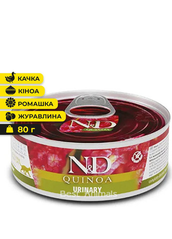 Farmina N&D Cat Quinoa Urinary - це повнораціонний дієтичний корм для кішок, рекомендований для зменшення рецидивів струвітних каменів і захворювань нижніх сечових шляхів у котячих. Особливості та переваги корму: Допомагає підтримувати та запобігати проблемам із сечовивідними шляхами; Містить оселедець, виловлений екологічно чистим способом, і качку, вирощену на волі; Багатий свіжою журавлиною, кіноа і ромашкою; У цьому рецепті не використовуються ксантан, касія, гуар, карагенан або промислові камеді; Без зерна і штучних консервантів. Упаковано в захисній атмосфері і піддано мінімальній обробці - використовується щадна парова технологія, упаковано в банку без вмісту бісфенолу А. Farmina N&D Quinoa Urinary використовує натуральні білки та інгредієнти, які допомагають вашій кішці підтримувати здоров'я сечовидільної системи. Містить свіжу качку, яйця, оселедець, свіжу журавлину, ромашку та кіноа, все це багате необхідними вітамінами та мінералами, як-от вітаміни A та C, антиоксидантами, амінокислотами та багато чим іншим, що допоможе заспокоїти вашу кішку та підтримувати здоров'я сечовивідних шляхів, запобігаючи утворенню каменів (струвітів) та каменів у сечовому міхурі (уролітіазів оксалатів). Farmina Quinoa Wet Food - збалансований і повноцінний рецепт, що підходить для дорослих кішок. Інгредієнти: Філе качки (60%), оселедець, варені яйця, екстракти насіння кіноа (5%), риб'ячий жир, журавлина, ромашка, фруктоолігосахариди, хондроїтину сульфат, глюкозамін, вітаміни, мінерали. Аналітичний склад: Сирий протеїн - 12,5%; Сирі жири - 5,4%; Сира клітковина - 0,7%; Сира зола - 3,2%; Кальцій - 0,16%; Фосфор - 0,15%; Натрій - 0,2%; Калій - 0,3%; Магній - 0,01%; Хлориди - 0,7%; Сірка - 0,1%; Вологість - 75%. Харчові добавки на 1 кг: Вітамін А - 4800 МО; Вітамін D3 - 320 МО; Вітамін Е - 160 мг; Холіну хлорид - 501 мг; Цинк - 36 мг; Марганець - 6,8 мг; Залізо - 16,8 мг; Мідь - 2,9 мг; DL-метіонін технічно чистий - 3000 мг; Таурин - 800 мг; L-карнітин - 50 мг. Добавки, що підкислюють сечу: дигідрат сульфату кальцію (1,5 г/кг). Енергетична цінність: 1083 ккал/кг.