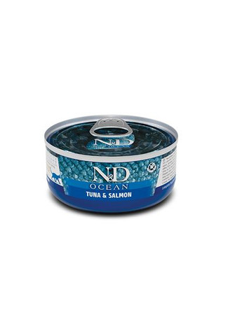 Farmina N&D Cat Ocean Tuna, Sardine and Shrimp - повноцінний вологий корм із тунцем, сардинами та креветками. Призначений для дорослих кішок усіх порід. Спеціально розроблена формула містить до 70% тунця, сардин і креветок, що робить їжу багатим джерелом легкозасвоюваного білка. Основні переваги складових корму: Тунець - риба, багата на амінокислоти і жирні кислоти Омега-3, які є важливим елементом раціону котів. Крім того, тунець містить вітаміни групи В, вітамін D3 і кальцій, які сприятливо впливають на процеси кровотворення, роботу нервової системи та кісткової системи; Сардини зміцнюють імунітет і зменшують запалення в організмі; Креветки багаті на вітамін В12, ніацином, фосфором та антиоксидантами; Вміст хондроїтину та глюкозаміну позитивно впливає на кістки та гнучкість суглобів, а риб'ячий жир підтримує імунну систему та допомагає доглядати за шкірою і шерстю улюбленця. Farmina N&D Cat Ocean Tuna, Sardine & Shrimp - це натуральний корм, приготований тільки з інгредієнтів найвищої якості. Інгредієнти: Стейк із тунця (55%), сардина (10%), креветки (5%), риб'ячий жир, свинина, курка, ягня, фруктоолiгосахаріди, хондроїтин сульфат, глюкозамін, вітаміни, мінерали. Аналітичний склад: Волога - 78%; Сирий протеїн - 12,3%; Сирий жир і олії - 4%; Сира клітковина - 0,4%; Сира зола - 2%. Харчові добавки на 1 кг: Вітамін A - 4800 МО; Вітамін D3 - 320 МО; Вітамін E - 160 мг; Холіну хлорид - 501 мг; Цинк - 36 мг; Марганець - 6,8 мг; Залізо - 16,8 мг; Мідь - 2,9 мг; DL-метіонін, технічно чистий - 1500 мг; Таурин - 800 мг; L-карнітин - 50 мг. Енергетична цінність: 1009 ккал/кг.
