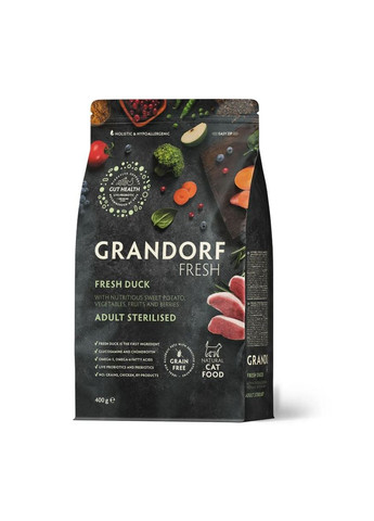 Інноваційний низькозерновий гіпоалергенний корм з живими та корисними пробіотичними бактеріями для стерилізованих котів і кішок з ослабленим й чутливим травленням, схильні до алергії на зернові. Не містить: кукурудзу, пшеницю, горох, курятину, яйця, курячий жир, субпродукти, сою, глютен, ГМО, штучні барвники, штучні ароматизатори та консерванти. 109 живих пробіотиків (1 000 000 000 один мільярд Enterococcus faecium) на 1 кг продукту. Щоденне вживання сприяє відновленню і підтримці мікрофлори кишківника. На правильній роботі системи травлення ґрунтується загальне здоров'я і стан організму вихованця. Формула насичена океанічною рибою, Omega-6 і Omega-3 жирними кислотами для чудового стану шкіри й шерсті, а знижений вміст жирів і підвищений вміст білків, а також L-Карнітин сприяють підтримці ваги та м'язової маси вихованця в оптимальній формі. Корм Grandorf з унікальною формулою забезпечує необхідний рівень кислотності сечі (pH: 6-6,5), знижуючи ризик виникнення сечокам'яної хвороби. Інновації корму GRANDORF: Живі пробіотики (стабілізатори кишкової флори); Антарктичний криль (біоелементи, біоактивні білки, фосфоліпіди Omega-3); Борошно з плоду ріжкового дерева (натуральний біорегулятор травлення); SYNOX 3D (комплекс натуральних антиоксидантів). Переваги корму GRANDORF: Гіпоалергенний склад інгредієнтів класу HOLISTIC; 1,000,000,000,000 КУО / кг живих пробіотиків (Enterococcus faecium); 70% високоякісного м'яса в складі корму GRANDORF; Понад десять корисних властивостей для здоров'я вихованця; Натуральний комплекс антиоксидантів, вітамінів і мінералів; Оптимальний баланс жирних кислот Omega-6 і фосфоліпідів Omega-3 для оздоровлення шерстяного покриву та шкіри вихованця; Формула збережена завдяки натуральним консервантам — вітамінам C і E; Особливо дбайлива технологія виготовлення корму (до 80 °С) із застосуванням високого тиску, зберігає корисні вітаміни всіх складових; Низька норма годування і висока засвоюваність досягаються використанням особливо підібраних інгредієнтів, виключно багатих поживними речовинами, що дуже корисно для здоров'я та добробуту вихованця. Корисні властивості GRANDORF: Захист серцево-судинної системи; Профілактика сечокам'яної хвороби (Склад формули підтримує необхідний рівень кислотності сечі (pH: 6-6,5), що знижує ризик виникнення сечокам'яної хвороби та підтримує здорове функціонування нирок); Профілактика зубного каменю і догляд за ротовою порожниною; Підтримка корисної та зниження патогенної мікрофлори; Підтримка здорової імунної системи; Підтримка чудового стану шкіри й шерсті завдяки жирним кислотам у складі корму; Підтримка і поліпшення зору; Поліпшення травлення і зниження харчової алергії; Поліпшення обміну речовин і підтримка ідеальної ваги; Зміцнення суглобів і розвиток м'язів; Виведення волосяних грудок. Склад: Дегідроване м'ясо індички (17%), Дегідроване м'ясо качки (16%), Дегідроване м'ясо дикого кабана (15%), Цільнозерновий коричневий рис, Сушений батат, Дегідроване м'ясо ягняти (10%), Свіже м'ясо індички (8%), Жир індички (2%), Борошно плодів ріжкового дерева, Порошок коренів цикорію (натуральне джерело пребіотиків: FOS та інулін), Рослинна клітковина, Пивні дріжджі (природне джерело MOS), Свіжа олія лосося (1%), Сушений антарктичний криль (натуральне джерело EPA і DHA, 1%), Сушене яблуко, Сушена журавлина, Юкка Мохаве. Аналітичні складові: Сирий протеїн: 37%; Сира клітковина: 2,5%; Сирий жир: 