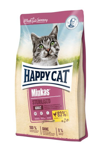 Happy Cat Minkas Sterilised – це збалансований повноцінний корм, розроблений з урахуванням особливих потреб кастрованих котів та стерилізованих котів. Завдяки спеціальній рецептурі з низьким рівнем жирів та оптимальним вмістом баластових речовин, цей корм сприяє підтримці ідеальної ваги за достатньої фізичної активності кота. Виготовляється у Німеччині з дотриманням суворих стандартів якості. • Ідеальний корм для кастрованих кішок та стерилізованих кішок • Омега-3 та омега-6-жирні кислоти • DL – метіонін – для підтримки здоров'я сечостатевої системи • Юкка Шідігера для зменшення неприємного запаху • Три різні форми гранул додають елемент гри в живлення і, тим самим, підвищується смакова привабливість.