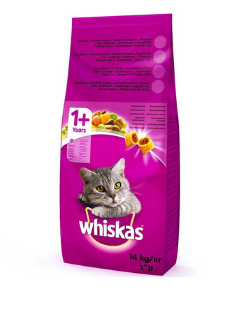 Корм Whiskas з куркою - Повнораціонний сухий корм для дорослих кішок (від 1 року). Відомо, що кішки відрізняються особливою вередливістю в їжі. Вони роблять свій вибір, покладаючись не тільки на смак, але і ще текстуру їжі. Тому Whiskas створив смачні подушечки, у яких хрустка оболонка приховує всередині ніжний паштет. 100% збалансований та повноцінний раціон на кожен день Без доданих штучних барвників або ароматизаторів Натуральне джерело клітковини Збалансований мінеральний комплекс - для підтримки здоров’я сечовивідних шляхів З вітаміном А - необхідним для міцного та чіткого зору З цинком - необхідним для здорової шкіри та шерсті З таурином - для підтримки здорового серця З протеїнами високої якості, з корисною морквою та горошком – для гарного травлення Інгредієнти Склад: злаки, м’ясо та продукти тваринного походження (включаючи 4% курятини в коричневих гранулах*), олії та жири, екстракти рослинних білків, продукти рослинного походження, мінеральні речовини, овочі (включаючи 0,5% сушеної моркви (що еквівалентно 4% моркви) в помаранчевих гранулах та 1% сушеного горошку (що еквівалентно 4% горошку) в зелених гранулах*), цукор, дріжджі. *Коричневі гранули зазвичай складають 70% продукту, помаранчеві та зелені гранули зазвичай складають рівномірно по 8% продукту. Поживна (харчова) цінність на 100г (%): сирий протеїн - 32, сирий жир - 12.5, сира зола – 8.7, сира клітковина – 1.5, Омега-6 жирні кислоти – 2.2, волога - 6. Харчові додатки на 1 кг: антиоксиданти, харчові барвники, а також додатки: вітамін A - 4760 МО, вітамін D3 - 525 МО, вітамін E - 96 мг, сульфат міді пентагідрат – 16 мг, сульфат марганцю моногідрат – 67.5 мг, йодистий калій – 1.3 мг, селеніт натрію – 0.38 мг, сульфат цинку моногідрат – 180 мг, таурин – 1870 мг. Енергетична цінність (калорійність): 373 kcal (ккал) /1562 kJ (кДж)