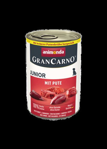 Корм суперпреміум класу GranCarno Junior з індичкою – найкращий вибір для збалансованого, смачного та здорового раціону цуценят першого року життя. Виготовлені із ретельно відібраних свіжих м’ясних інгредієнтів, ці консерви гарантують неперевершений смак, що змусять вашого пухнастого вихованця виляти хвостом від радощів. Маленькі, зручні для цуценят шматочки 100% свіжі м'ясні інгредієнти Без зерна, без глютену, без сої, без цукру Без штучних барвників і консервантів Склад: 53% свинини (серце, печінка, легені, м'ясо), 28,5% бульйону з індички, 15% індички (серце, шлунок, горло), мінерали, сафлорова олія, лососева олія. Аналітичний склад: білок 11%, жир 5%, сира клітковина 0,3%, сира зола 2,4%, вологість 79%. Харчові добавки: 200 МО вітаміну D3 1,4 мг, моногідрат сульфату марганцю, 25 мг моногідрату сульфату цинку, 0,5 мг пентагідрату сульфату міді (II). 200 МО вітаміну D3, 0,75 мг йодату кальцію, 1 мг пентагідрату сульфату міді (II), 1,4 мг моногідрату сульфату марганцю, 25 мг моногідрату сульфату цинку. Енергетична цінність на 100 г у МДж: 0,4 Рекомендації щодо годування: 1,1 - 2,2 кг (3 місяці) – 200 - 340 г; 2,6 - 3,7 кг (4 місяці) – 385 - 500 г; 2,6 - 3,7 кг (5 - 6 місяців) – 410 г; 2,6 - 3,7 кг (> 6-ти місяців) – 425 г; 5,2 - 7 кг (5 - 6 місяців) – 690 г; 5,2 - 7 кг (> 6-ти місяць) – 785 г. При розрахунку розміру порції для собак завжди слід враховувати вік, вагу і темперамент улюбленця.