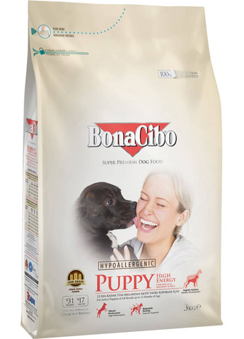 Переваги: Сухий корм для харчування цуценят супер-преміум класу, а також вагітних і лактуючих сук Оптимальний баланс мінералів забезпечує цуценятам правильний ріст та розвиток кісток Збагачений вітамінами, амінокислотами, Омега-6 і Омега-3 жирними кислотами, які в правильному співвідношенні сприяють здоров'ю шкіри і сяянню шерсті Завдяки пробіотикам підтримують імунітет цуценят щоденно Піклується про оптимальну вагу цуценят при народженні та гарантує високопоживне молоко під час лактації Упаковка з зіпером для запобігання потрапляння вологи до корму Склад: висушене куряче м'ясо (40%), рис бальдо (18%), маїс, очищений курячий жир, борошно з анчоусів (8%), висушені пивні дріжджі, жир з анчоусів, плоди ріжкового дерева, гідролізована куряча печінка, нуклеотиди дріжджового протеїну , висушений жом з буряка, мінерали, пребіотики маннан-олігосахариди, морські водорості, порошок чорниці, екстракт юкки, псиліум, порошок календули. Гарантований аналіз: Протеїн - 31% Жир - 17% Зола - 8% Клітковина - 2,5% Омега-6 - 3,8% Омега-3 - 0,8% Харчові добавки: Вітамін A 37.500 МЕ / кг Фолієва кислота 0,80 мг / кг Вітамін D3 2.250 МО / кг Ніацин 30 мг / кг Вітамін E 400 мг / кг Біотин 0,37 мг / кг Вітамін K3 0,49 мг / кг Мідь (сульфат) 20 мг / кг Вітамін C 200 мг / кг Цинк (сульфат) 110 мг / кг Вітамін B1 4,38 мг / кг Цинк (хелат) 30 мг / кг Вітамін B2 9,54 мг / кг Марганець (сульфат) 33 мг / кг Вітамін B6 3,88 мг / кг Селен (селеніт) 0,34 мг / кг Вітамін B12 0,09 мг / кг Глюкозамін 1.200 мг / кг Пантотенова кислота 38,84 мг / кг Хондроїтин 800 мг / кг Рекомендації по годуванню: Для цуценят відповідно до віку: 0 – 3 місяців 3 – 5 місяців 5 – 12 місяців Вага цуценяти, кг Кількість корму, грам/день Вага цуценяти, кг Кількість корму, грам/день Вага цуценяти, кг Кількість корму, грам/день 1 – 3 110 – 195 1 – 3 80 – 175 1 – 3 50– 110 3 – 5 195 – 275 3 – 5 175 – 260 3 – 5 110 – 165 5 – 10 275 – 450 5 – 10 260 – 400 5 – 10 165 – 240 10 – 20 450 – 690 10 – 20 400 – 640 10 – 20 240 – 375 20 – 30 690 – 795 20 – 30 640 – 820 20 – 30 375 – 530 - - 30+ 820 – 990 30+ 530 – 700 В период беременности и лактации в соответствии к периоду кормления: Початок періода Середина періода Пізній період Вага собаки, кг Кількість корму, грам/день Вага собаки, кг Кількість корму, грам/день Вага собаки, кг Кількість корму, грам/день 1 – 5 57 – 145 1 – 5 65– 165 1 – 5 75– 190 5 – 20 145 – 315 5 – 20 165 – 355 5 – 20 190 – 410 20 – 40 315 – 515 20 – 40 355 – 580 20 – 40 410 – 670 40 – 60 515 – 690 40 – 60 580 – 780 40 – 60 670 – 900 60 – 80 690 – 860 60 – 80 780 – 970 60 – 80 900 – 1120 80 – 120 860 – 1035 80 – 120 970 – 1170 80 – 120 1120 – 1350 Норми, наведені в таблиці є орієнтовними. Для вагітних і лактуючих сук рекомендується забезпечити вільний доступ до корму. Спеціально розроблена формула для годування цуценят з першого прикорму до 12 міс, а також для вагітних і лактуючих сук.Раціони для цуценят можна давати з моменту відлучення. Змочіть кілька гранул теплою водою, але не молоком. Рекомендуємо від першого підкорму до 3 місячного віку годувати зволоженим кормом. Але не забувайте про постійний доступ до чистої питної води. Раціон BonaCibo Puppy High Energy найкращим чином подходітт для вагітних тварин в останню третину вагітності, тобто в останні 20 днів. Фасування: 100 г, 3 кг, 15 кг