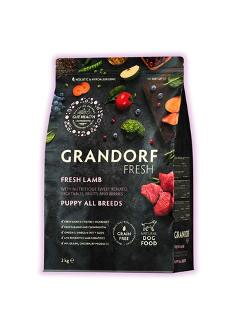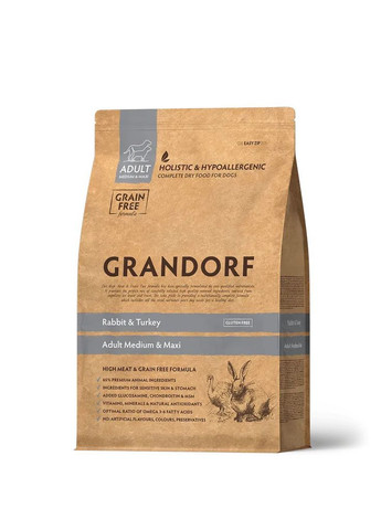 Grandorf Dog Lamb & Turkey Adult Mini Breeds — це сухий революційний гіпоалергенний низькозерновий корм для собак міні порід з ягням та бурим рисом. Корм класу холістик з 70% натурального м'яса (без субпродуктів) у складі, які ідеально підходять для щоденного харчування собак з чутливим травленням, компоненти корму покращують обмін речовин, сприяють нормальному травленню, підтримують гарне самопочуття та імунітет. Корм розроблений спеціально для мініатюрних порід собак, виготовлений зі свіжих інгредієнтів найвищої якості, вони навіть підходять у їжу людині! Підходить для собак від 1 року. Високий вміст протеїнів, корисних жирів, амінокислот та вітамінів забезпечать необхідною енергією собак дрібних порід. І має ідеальний розмір гранул 7 мм. В основі хорошого здоров'я та довголіття всіх живих істот лежить правильна робота системи травлення. Її забезпечує збалансований та різноманітний раціон, яким і є корм Grandorf з ягням та бурим рисом. У складі представлені 2 види м'яса, які внесуть різноманіття у меню собаки. М'ясо індички — найдієтичніший вид білка, має низьку калорійність, легку засвоюваність, практично не містить жиру, при цьому цей білок має повний склад усіх незамінних амінокислот, а також багатий вітамінами B2, B6, B12 і мінералами. М'ясо ягня — гіпоалергенний вид білка, який найкраще засвоюється у собак, багатий на вітаміни групи B, калієм, магнієм і лецитином. Цей продукт у складі корму підтримує гарне самопочуття собаки та роботу серця. Серед ключових інгредієнтів є бурий рис, який є відмінним джерелом клітковини та має низький глікемічний індекс, і так само покращує травлення. Цикорій покращує обмін речовин та нормалізує травлення, заспокоює нервову систему собак, знижує рівень холестерину в крові. Журавлина є природним антиоксидантом та антисептиком, покращує роботу сечовивідних органів, профілактує цистити у собак, виводить токсини з печінки, покращує роботу нирок. Зелені яблука багаті на клітковину, покращують травлення та прискорюють обмін речовин. Антарктичний криль у складі корму містить велику кількість натуральних мікро- та макронутрієнтів, сприяє роботі головного мозку, покращує роботу серця та суглобів. Плід ріжкового дерева виводить токсини з організму, знижує холестерин, покращує травлення. Не містить: кукурудзу, пшеницю, горох, курятину, яйця, курячий жир, субпродукти, сою, глютен, ГМО, штучні барвники, штучні ароматизатори та консерванти. Переваги: 70% м'яса у складі; 2 види дієтичного м'яса; Низькозерновий склад; 27% білки, 15% жири; Тільки гіпоалергенні інгредієнти; Комплекс хондропротекторів; Баланс співвідношення Omega-3 та Omega-6; Контроль рівня кислотності рН; Низький рівень золи у складі; Натуральні антиоксиданти; Бережний спосіб приготування. Склад: Дегідроване м'ясо ягняти (23%), Дегідроване м'ясо індички (22%), Цільнозерновий коричневий рис, Свіже м'ясо ягняти (9%), Свіже м'ясо індички (9%), Жир індички (5%), Порошок коренів цикорію (натуральне джерело пребіотиків: FOS та інуліну), Борошно з плодів ріжкового дерева, Сушене яблуко, Олія лосося (1%), Сушений антарктичний криль (натуральне джерело EPA і DHA, 1%), Пивні дріжджі (натуральне джерело MOS), Глюкозамін (1000 мг / кг), Хондроїтин сульфат (1000 мг / кг), MSM (метілсульфонілметан, 40 мг / кг), Сушена журавлина, Юкка Мохаве. Аналітичні складові: Сирий протеїн: 27%; Сира клітковина: 3%; Сирий жир: 15%; Сира зола: 7,5%; В