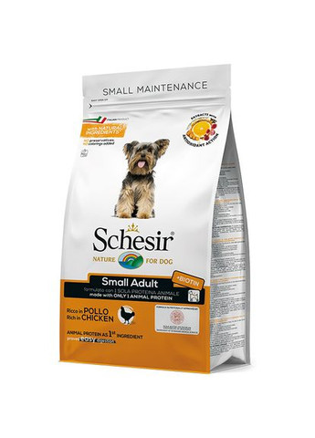 Schesir Dog Small Adult Chicken – повноцінний збалансований раціон для собак малих порід, що складається з натуральних інгредієнтів з додаванням комплексу вітамінів та мінералів, необхідних для здоров'я та довголіття вашого вихованця. З високим вмістом м'яса курки без додавання інших джерел тваринного білка – монопротеїнова формула. Даний корм рекомендується для собак віком від 1 до 7 років. Раціон також підходить для вагітних і годуючих сук.