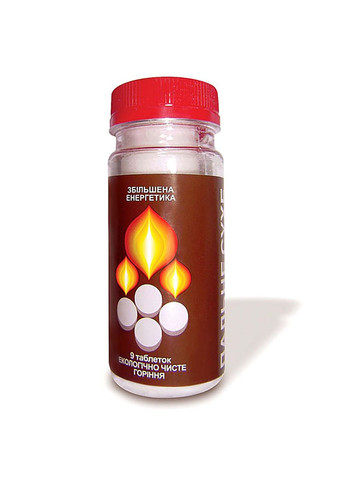 Без запаху та шкідливих парів, абсолютно безпечний та екологічний варіант для підігріву їжі, напоїв, обігріва палатки, розпалювання печей та камінів. Розпалюється в будь яких погодних умовах. Вага одніеї таблетки ~15г, розмір приблизно 3*3 см Час горіння близько 15 хвилин (в залежності від умов використання) 0,5 кг- 30 таблеток 1 кг- 60 таблеток