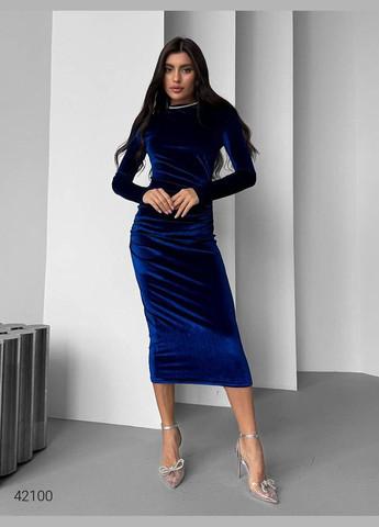 Вечірня сукня макси. Приталена по фігурі, з високим розрізом на довгій рукаві. Розміри: 46-48, 50-52, 54-56, 58-60. Виміри: 46-48: об'єм грудей – 84 см (розтягується до 100 см), об'єм талії – 72 см (розтягується до 84 см), об'єм стегон – 92 см (розтягується до 108 см), довжина сукні – 149 см, довжина рукава – 60 см. 50-52: об'єм грудей – 92 см (розтягується до 108 см), об'єм талії – 80 см (розтягується до 92 см), об'єм стегон – 100 см (розтягується до 116 см), довжина сукні – 150 см, довжина рукава – 60 см. 54-56: об'єм грудей – 100 см (розтягується до 116 см), об'єм талії – 88 см (розтягується до 100 см), об'єм стегон – 108 см (розтягується до 124 см), довжина сукні – 151 см, довжина рукава – 60 см. 58-60: об'єм грудей – 108 см (розтягується до 124 см), об'єм талії – 96 см (розтягується до 108 см), об'єм стегон – 116 см (розтягується до 132 см).