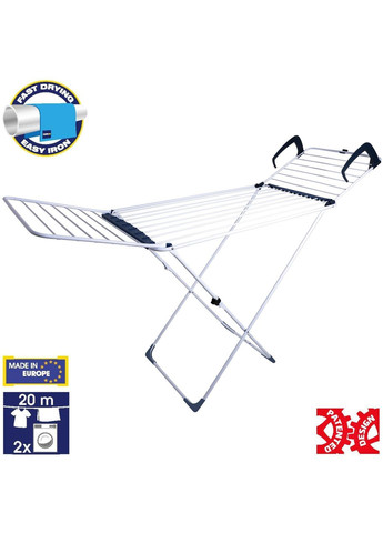 Доволі індивідуальна конструкція робить сушарку Casa Si Peak ідеальною для приміщень, де під сушарку початково виділене місце і немає потреби постійно складати-розкладати сушарку. Безперечною перевагою моделі є товсті стрижні діаметром 10 мм, що пришвидшують процес сушіння, та бічні консолі, що дозволять сушити речі довжиною до 140 сантиметрів прямо на плічках. Також сушарка має 4 повноповоротних великих коліщатка з механізмом блокування. Бічні крила сушарки складаються вниз, якщо в них немає необхідності, таким чином на верхніх крилах сушарки можна сушити білизну довжиною більше 3-х метрів. Повна робоча поверхня становить 16 метрів, що вистачає для сушки білизни після одного з половиною цикла прання стандартної п'ятикілограмової пральної машинки. Незважаючи на те, що сушарка поставляється в розібраному вигляді, процес збірки займає не більше 15 хвилин завдяки тому що всі елементи промаркеровані згідно докладної інструкції, що поставляється в комплекті. Технічні характеристики: Тип: сушарка підлогова Робоча довжина поверхні, м: 16 Орієнтовна кількість завантажень білизни з пральної машинки, шт: 1.5 Максимальне допустиме навантаження, кг: 15 Діаметр стрижня, мм: 10.0 Кількість стрижнів, шт: 21 Матеріал: сталь Колір: White (білий) Особливості конструкції: ProLine - в якості стрижнів використані металеві порожнисті трубки діаметром 10 мм, що з одного боку зменшують появу зім'ятих смуг на білизні та пришвидшують процес сушіння, а з іншого боку зменшують вагу конструкції. Чотири великих повнообертових коліщатка в опорній стійці, два з яких мають механізм блокування, призначені для зручності пересування та фіксації на місці навантаженої сушарки (це також запобігає псуванню підлогового покриття). Дві бічні пластикові консолі дозволяють сушити одяг довжиною до 140 см на плічках (тремпелях). Консолі знімаються, або складаються всередину сушарки, коли в них немає необхідності. Шість бічних крил сушарки фіксуються в робочому положенні пластиковими скобами, а коли сушарка не використовується - можуть бути складені вниз. Комплектація: (1) Гвинти - 12 шт (2) Бічні пластикові накладки каркасу - 12 шт (3) Сталеві бічні стрижні - 18 шт (4) З'єднувальні пластикові шарніри - 6 шт (5) Бічні консолі для плічків - 2 шт (6) Бічні вертикальні стійки 40 см - 4 шт (7) Бічні вертикальні стійки 69 см - 2 шт (8) Пластикові компоненти нижньої рами каркасу - 2 шт (9a) Колеса з механізмом блокування - 2 шт (9b) Колеса без механізму блокування - 2 шт (10) Сталеві компоненти нижньої рами каркасу - 2 шт (11) Сталеві центральні стрижні - 3 шт (12) Пластикові з'єднувальні скоби для фіксації сушарки в робочому стані - 6 шт (13) Інструкція Габарити і вага: Розміри розкладеної сушарки, мм: 1290х1600х570 Розміри складеної сушарки, мм: 740х160х440 Розміри в упаковці, мм: 730х170х105 Вага без упаковки, кг: 3.485 Вага в упаковці, кг: 3.8 Виробник: Casa Si (Австрія) Термін гарантії: 2 роки