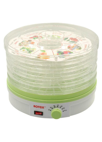 Фруктова сушарка служить для сушки і подальшого зберігання висушених продуктів. Сушка - дуже м'який метод консервації. Потужність сушки Rotex 520 Вт. Є регулятор температури з функцією вимикача. Діаметр полки 36 см і висота полки 4 см. Довжина шнура включення 1,7 м. У комплекті лоток для пастили.