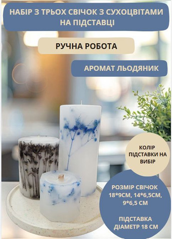 «Небесне Провансальне Тріо» Відкрийте для себе досконалість природної естетики з нашим набором свічок «Небесне Провансальне Тріо» — створеним для тих, хто цінує красу природи та витончений стиль. Що входить у набір: Свічка-циліндр (14×6,5 см) — з блакитною гіпсофілою, яка надає відчуття свіжості й легкості. Свічка-циліндр (9×6,5 см) — з лавандою, яка приносить заспокоєння та ніжний аромат Провансу. Восьмикутна свічка з дерев'яним гнотом — з блакитною гіпсофілою, що створює затишну атмосферу з природним потріскуванням. Кругла гіпсова підставка з бортиком — стильний та практичний аксесуар, що додає завершеності цьому комплекту (колір на вибір) Подаруйте затишок та стиль у кожній деталі! Також Ви можете вибрати, як доповнення подарункову упаковку (біла коробка+атласна стрічка) Особливості: Аромат: Ягідний мікс Склад: парафін, ароматизатор свічки, сухе гілочки блакитної гіпсофіли і лаванди. Увага: можливе незначне виділення арома олій на поверхню воску, що є абсолютною нормою. Це не впливає на якість горіння 100%повтор свічки, як на фото неможливий, оскільки кожен сухоцвіт унікальний від природи. Власне виробництво, усі наші товари виготовлені в ручну Відтінок кольору може трохи відрізнятися від представленого на фотографії, залежно від налаштувань екрану, а також умов освітлення в час