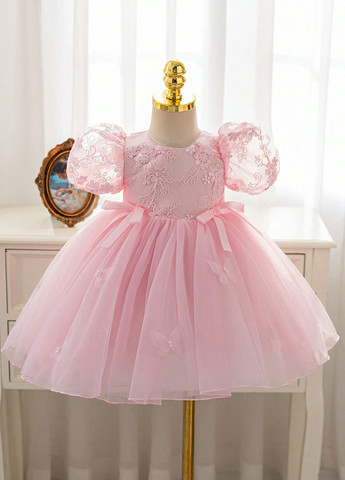 Сукня для дівчаток-підлітків із квітковим принтом, рожева. Ця елегантна сукня ідеально підходить для особливих випадків. Круглий виріз горловини та рукави-буфи. Розкльошений поділ та висока талія.