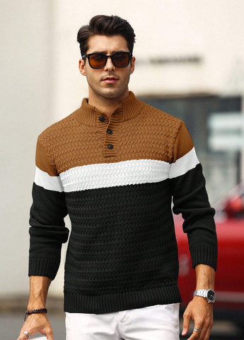 Manfinity Homme – светр виготовлений із тканини з легким розтягуванням, має багатобарвний візерунок кольорових блоків на довгих рукавах. Виріз коміра-стійки надає нотки стилю, а застібка на ґудзиках забезпечує практичність. Цей повсякденний светр, що підходить для зимового носіння, забезпечує комфорт та універсальність.