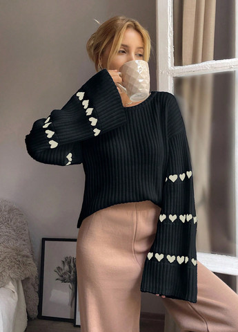 Жіночий светр класичного фасону з сердечками. Виготовлений із якісної суміші пряжі акрил/вовна. Матеріал м'який, теплий, приємний до тіла та забезпечує комфорт у прохолодну пору року. Класичний светр з круглим вирізом (коміром). Декорований милими сердечками на рукавах, що додає образу грайливості та ніжності. Завдяки теплому матеріалу та універсальному дизайну, светр ідеально підійде для повсякденного носіння, роботи, прогулянок або зустрічей.