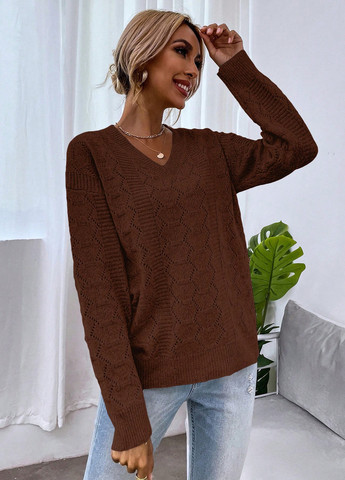 Жіночий пуловер з довгим рукавом та V-подібним вирізом SHEIN LUNE. Цей повсякденний светр має стандартний крій та класичний дизайн з V-подібним вирізом. Він має спущене плече та злегка еластичну тканину ажурної в'язки. Поділ має форму стандартного крою.