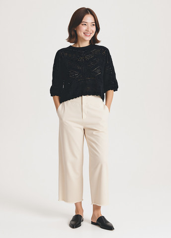 Пуловер з м'якого ажурного трикотажу з круглим вирізом горловини, спущеними плечима та ребристими манжетами по горловині, рукавах і подолі.