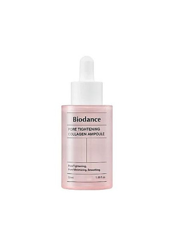 Зміцнююча ампула для звуження пір Biodance - Pore Tightening Collagen Ampoule - зміцнююча ампула для обличчя, призначена для зменшення помітності розширених пір і підвищення еластичності шкіри. Містить низькомолекулярний колаген і еластин, які працюють разом, щоб покращити еластичність в'ялої шкіри.Пептиди борються зі зморшками, а ніацинамід звужує пори. На додаток, гіалуронова кислота гарантує зволожуючий ефект.Продукт рекомендований для шкіри, якої бракує пружності, з розширеними порами чи ознаками старіння. Активні компоненти: низькомолекулярний колаген - надає зволожуючу дію, підвищує пружність і еластичність, звужує розширені пори, еластин - зміцнює, бореться з зморшками, покращує еластичність, пептиди - надають зміцнюючий ефект, покращують еластичність і гладкість шкіри, гіалуронова кислота - інтенсивно зволожує, покращує еластичність шкіри, ніацинамід - звужує пори, регулює виділення шкірного сала, освітлює шкіру. Дія засобу: надає пружність, візуально звужує пори, зволожує, підвищує еластичність. Спосіб використання: Нанести засіб на очищену шкіру обличчя. 30 ml